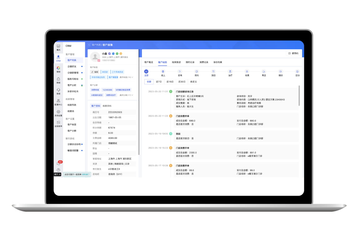整合多渠道客户数据,包括线上广告/获客平台、微信小程序、微信公众号、企业微信、自然到店(e看牙录入患者)等渠道的客户数据。