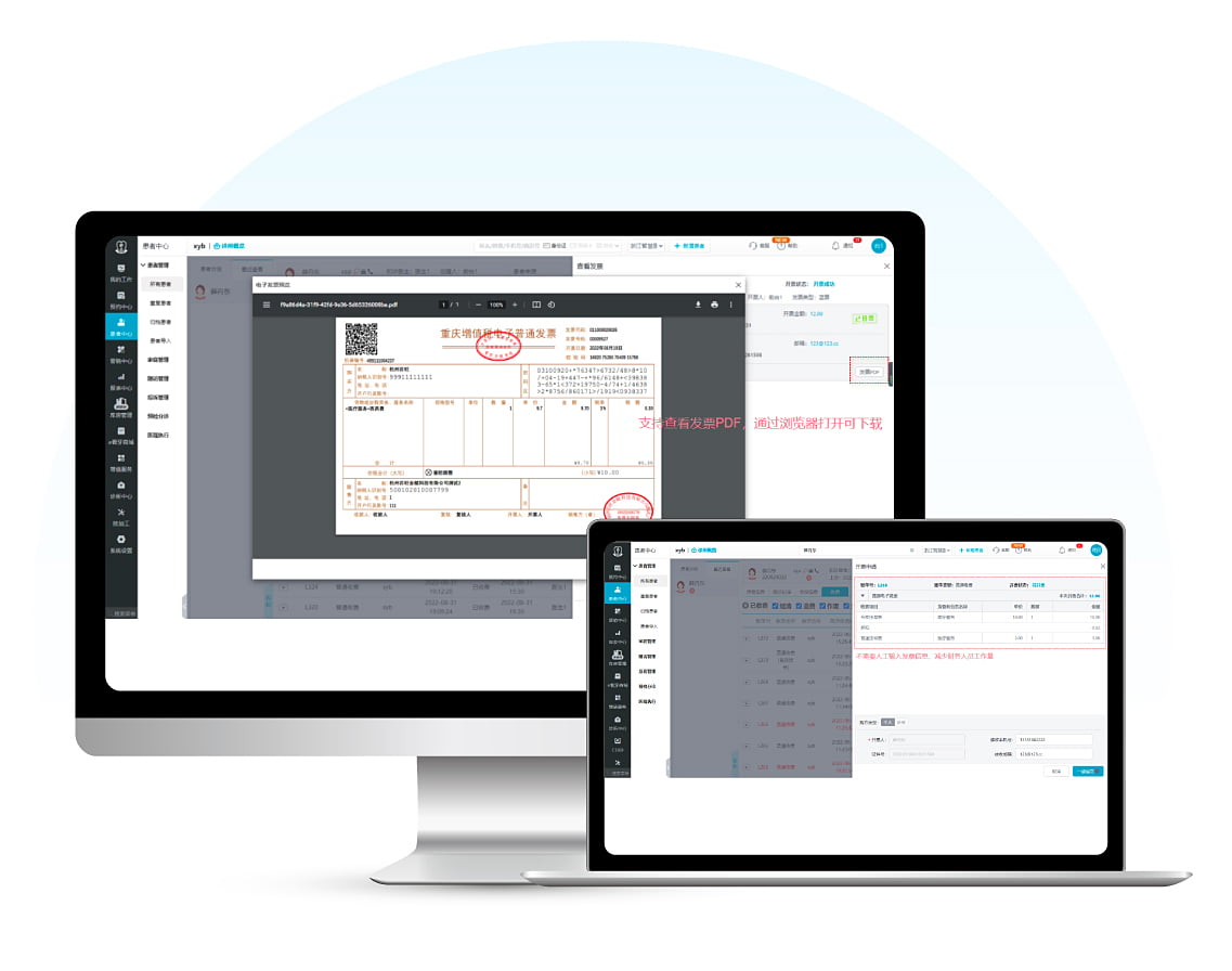 · 发票即时获取:直接推送电子发票给患者,随时随地自助取票,无